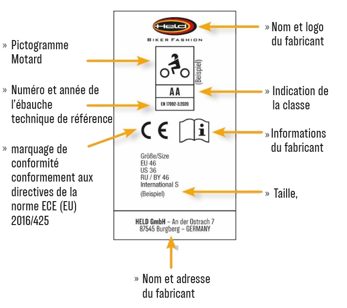 Conformément au règlement (UE) 2016/425, les vêtements de protection pour motos relèvent des « équipements de protection individuelle » (EPI) et sont testés et certifiés conformément aux normes EN respectives par un institut de test accrédité.